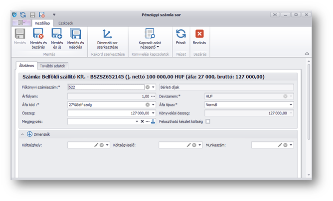 | Összeg: | A rögzítendő tétel összege, a sor összeg típus beállítástól függően nettó vagy bruttó értéket kell megadni. |