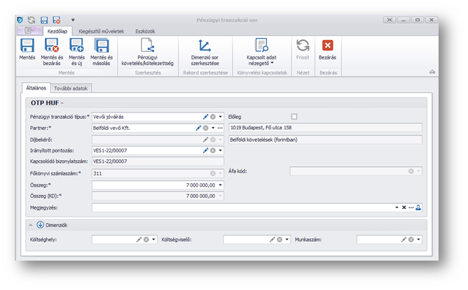 | Partner: | Partneri tranzakció esetén aktív a mező. A partneri törzsadatokból kiválasztható, hogy mely partnerünkhöz kapcsolódik a pénzügyi tranzakció. |