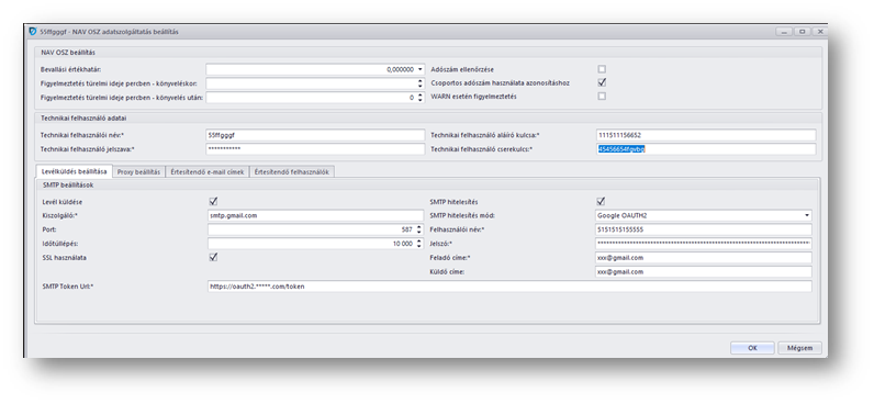 | SMTP hitelesítés mód: | Az SMTP szerver által megkövetelt hitelesítési módszer. A választható értékek: nincs, egyszerű, Microsoft OAUTH2, Google OAUTH2 |