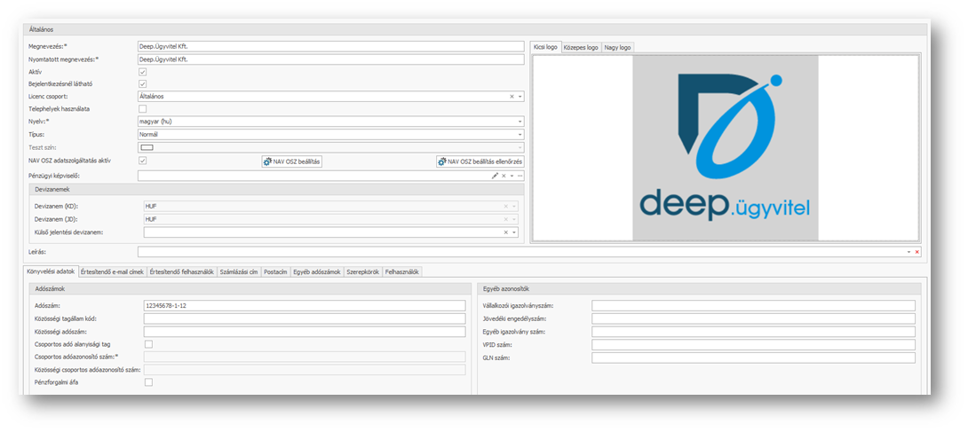 | Általános terület: | Ezen a területen találhatók az általános cégadatok. |