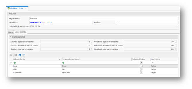 | Kiosztható teljes licencek száma: | A megvásárolt vagy bérelt teljes licencekből mennyi osztható még ki a felhasználóknak. |