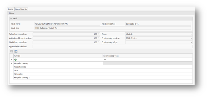 A funkcióban megnézhetjük, hogy milyen licenc-et használunk aktuálisan a programban. Itt végezhető el a licenc kiosztás a nevesített felhasználóknak.