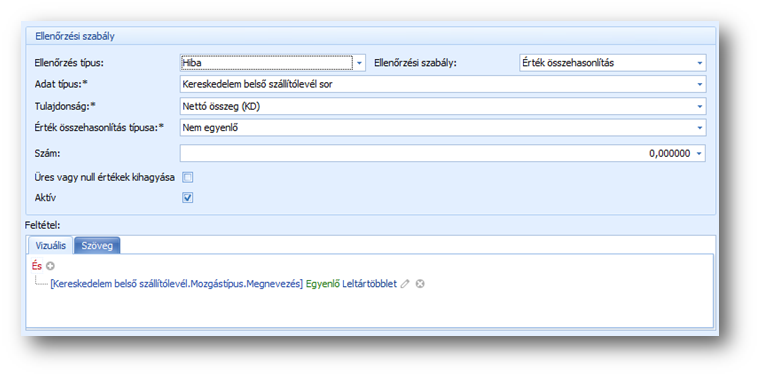 Szöveg összehasonlítás típusa: Tartalmazza / Végződik / Egyenlő / Nem egyenlő / Kezdődik, választással megadhatjuk, hogy mire történjen az összehasonlítás. Ellenőrzési szabály = [Szöveg összehasonlítás] esetén jelenik meg a mező.