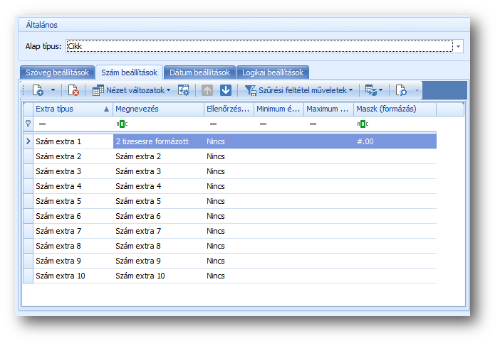 | Extra típus: | Szám extra 1 / .. / Szám extra 10, extra típus választás, amely típus jellemzőit szeretnénk módosítani. |