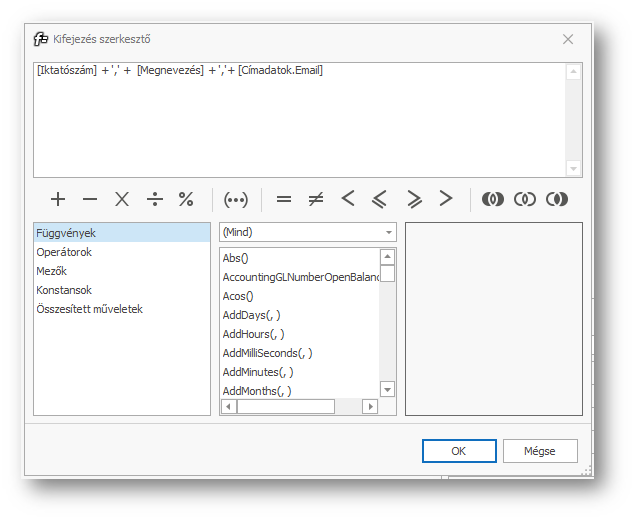 | Kifejezés: | A megnyíló kifejezés szerkesztő ablakban tudjuk megadni a feltételt a kereső mezőre. |