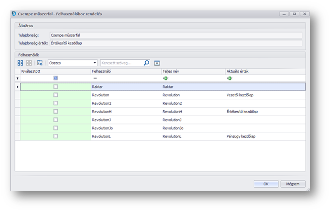 A listás áttekintőből a kiválasztott műszerfalat a "Felhasználóhoz rendelés" művelettel a "Csempe műszerfal - Felhasználóhoz rendelés" ablakban a szükséges felhasználók bepipálásával egyszerűen hozzárendelhetjük a kollégákhoz.