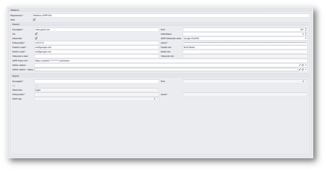 Amennyiben a hitelesítésnél OAUTH2 módszert használnak, úgy a beállításokhoz a saját e-mail szolgáltatójuk dokumentációjában találnak ehhez további információt.