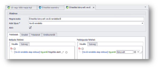 Itt hozhatók létre a belépési, és a feldolgozási feltételek teljesülése esetén küldendő e-mailek.