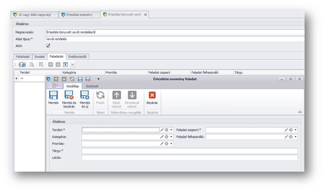 | Terület: | Az értesítés mely feladat terület alá kerüljön. A területek megnevezése, beállításai szabadon alakíthatók. |