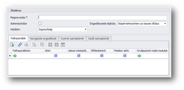 A rendszerben használt szerepkörök rögzítésére szolgáló funkció, amivel részletes (Modul/Funkció szint/Mező szint) jogosultsági szabályrendszer építhető fel a programban. A felvett szerepkörök megjelennek a Cég funkcióban is.