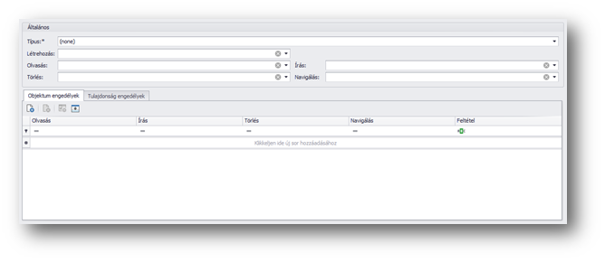 | Típus: | Adattípus választás, aminek meg akarjuk határozni az elérési lehetőségeit. (Pl: cikk törzsadat, partner törzsadat, pénzügyi számla fej vagy sor, főkönyvi bizonylat stb.) |