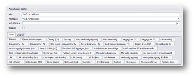 | Adattípus: | Ki kell választani azt a típust, amelyre vonatkozóan elemzést szeretnénk végezni. Kiválasztása után a Pivot alfülön megjelennek az elemezhető mezők. Lenti példában "Kereskedelmi vevői ajánlat". |