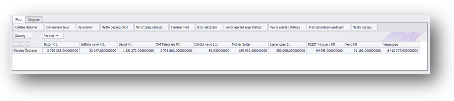 A Pivot alfülön a mezőket tartalmazó területre csak a néhány szükséges mezőt tegyük ki a többit távolítsuk el. Az "Összeg" mezőt húzzuk bele az első táblázatsor első oszlopába, erre a mezőre fog történni az összegzés. A "Partner" mezőt húzzuk az alsó sáv felső sötét területére, erre a mezőre fog történni a csoportosítást. Több mezőt is ide húzhatunk, így többszintű lesz a csoportképzés. A "Kereskedelmi vevői ajánlat alap státusz" és a "Devizanem" mezőkre adjuk meg a kívánt szűréseket.