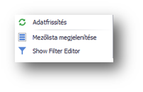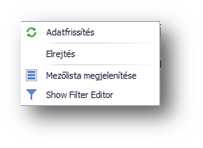 A pivot alfül mezőket tartalmazó területén jobbegeret nyomva "Adatfrissítés"-i és "Mezőlista megjelenítése" lehetőségeink vannak.