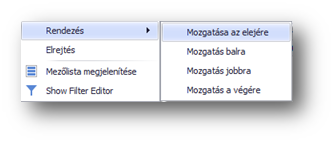 A pivot mezőkön jobbegeret nyoma ezen kívül "Elrejtés"-i és "Rendezési" lehetőségünk is lesz. A mezőn nyomott jobbegér / Elrejtés hatására az elem lekerül a területről és a Pivot tábla mezőlista képernyő (visszarakható) mezői közé kerül.