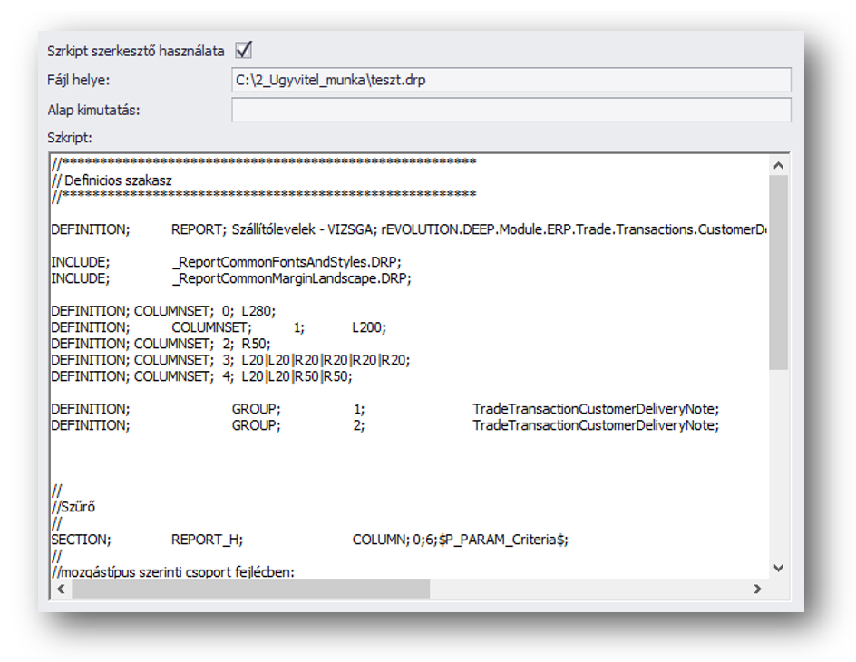 | Szkript: | A DRP-ben megadott szerkesztési utasításokat tartalmazza. |