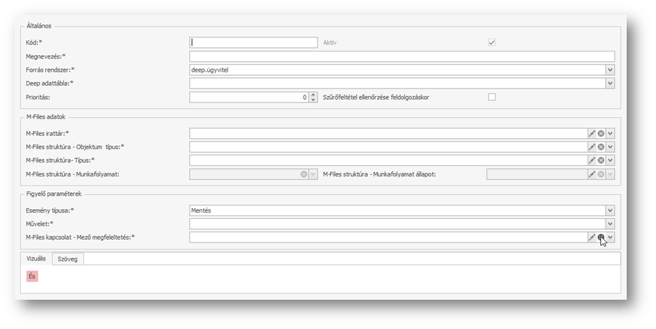 A funkcióban tudjuk megadni azt, hogy milyen események kapcsán, milyen feltétel teljesülése esetén kell kommunikálnia egymással a deep.ügyvitel-nek és az M-Files programnak. Amennyiben kétirányú a kommunikáció, akkor ugyanazon figyelőt rögzíteni kell deep.ügyvitel és M-Files forrás rendszer irányból is. A Figyelők - az első adat szinkron lefutása után - nem módosíthatók, inaktívvá lehet tenni a nem használt figyelőket.