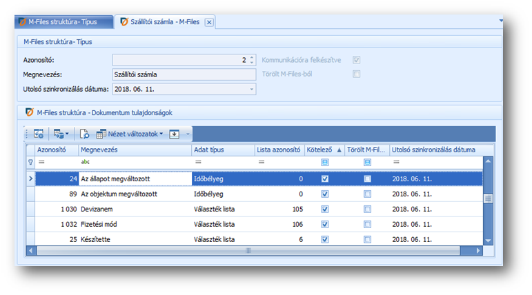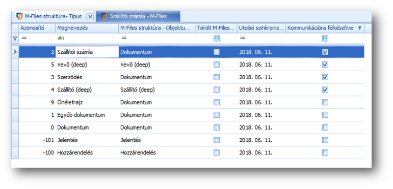 A funkció az M-Files struktúra Típusok megtekintésére szolgál, melyek akkor jelennek meg ha az irattár szinkron érvényes.
