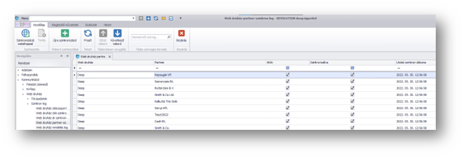 A "Szinkronizáció webshoppal" művelettel tudjuk a deep-ben történt, a partnerre vonatkozó változtatásokat átadni annak a webáruháznak, amelyet a művelet elindítása után választottunk ki. Csak azok a partnerek kerülnek bele a szinkron logba , ahol a partner kartonon be van pipálva a web áruházban látható jelölő (Partner karton-> Bővített adatok fül).