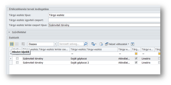 Lehetőségünk van az összes eszközt egyszerre kiválasztani a Mindet kijelöli gomb hatására, de akár néhány eszközt is kijelölni az eszköz neve előtt levő Kiválasztott pipa alkalmazásával. Segítségként a képernyő jobb alsó sarkában láthatjuk a kiválasztott eszközök bruttó értékének összegét. Ez akkor lehet nagy segítség, ha főkönyvi számonként és értékcsökkenési módszerenként nyitjuk meg az eszközöket, hisz ilyenkor könnyen le tudjuk ellenőrizni, hogy az összes eszközt kiválasztottuk-e.