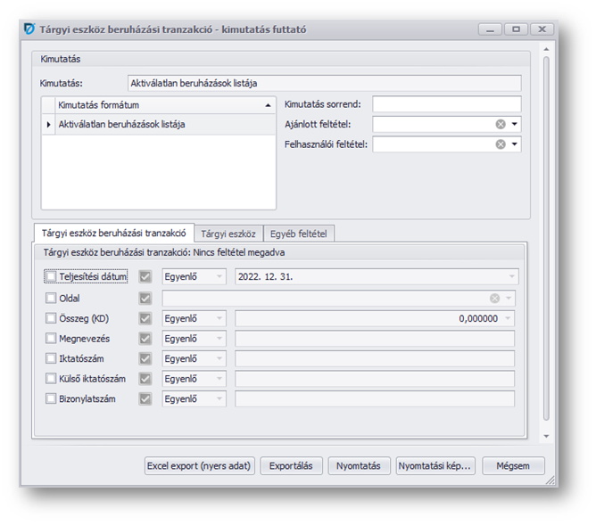 A listával az aktiválatlan beruházások analitikáját tudjuk kinyomtatni egyeztetés céljából. Megjelenő mezők: Tárgyi eszköz megnevezés, Iktatószám, Bizonylatszám, Teljesítési dátum, Előjeles nem felhasznált összeg (KD), Előjeles felhasznált, de nem aktivált összeg (KD), Előjeles nem aktivált összeg (KD).