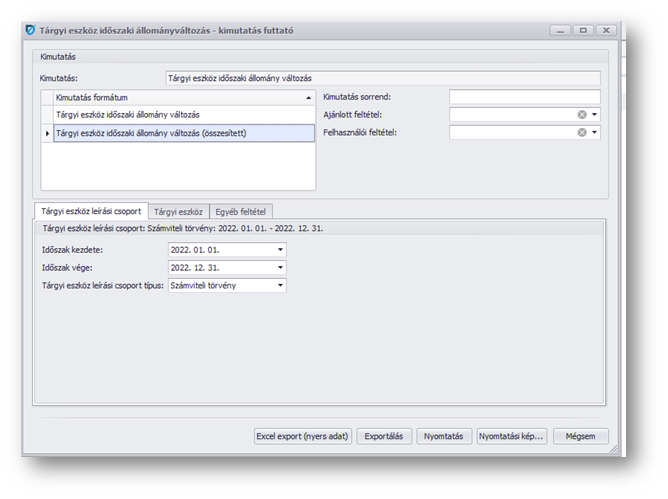 Tárgyi eszköz csoportonként összesítve, vagy Tárgyi eszközönként külön-külön is lekérhető a lista.