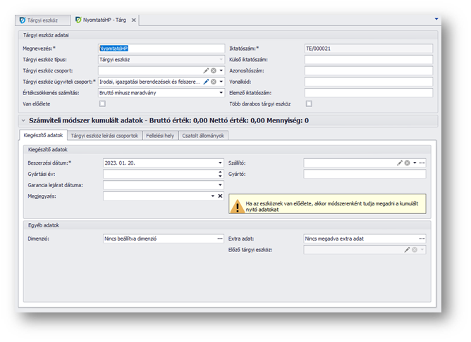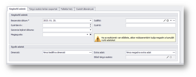 Kiegészítő adatok: Kiegészítő és egyéb adatok felvitelére van lehetőség. A Beszerzési dátum mező kitöltése kötelező, a többi opcionális. Az egyéb adatok között szerepelnek a könyvelést, csoportosítást megkönnyítő dimenziók, illetve extra adatok. Fontos tudni, hogy amennyiben beállítottunk dimenzió ellenőrzési szabályt (pl. minden 5,8,9 főkönyvi szám esetén kötelező kitölteni az 1. dimenziót), akkor célszerű itt megadni az eszközre jellemző 1. dimenziót, mert ilyenkor az automatikusan beöröklődik a tárgyi eszköz tranzakcióba, nem kell külön-külön tranzakciónként kitöltenünk.