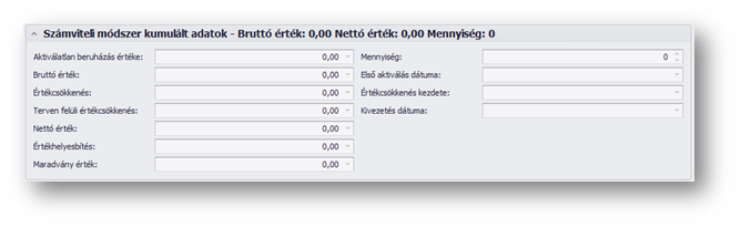 | Számviteli módszer kumulált adatok: | A rendszer automatikusan tölti a kartonon az értékeket. Új eszköz nyitásakor nem kell kitölteni, azért látjuk alap helyzetben zárt állapotban ezt a részt a felületen. Amíg az eszköz nem nyitott/aktivált, nincs még értéke, így minden mezője üres. |