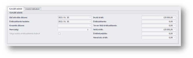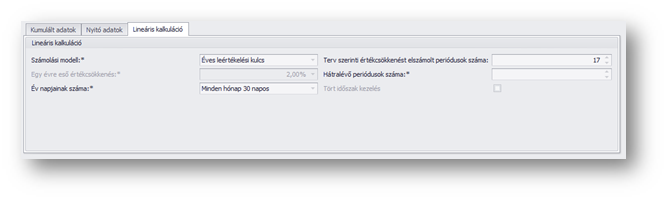 Lineáris kalkuláció fül: Akkor aktív, ha az Értékcsökkenési módszernél a Lineáris opciót választottuk ki.