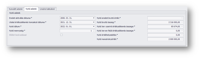 | Utolsó értékcsökkenés tranzakció dátuma: | Feltételezzük, hogy az előző rendszerben végig le lett futtatva az értékcsökkenés, így a nyitó dátum előtti napot célszerű itt feltüntetni. Pl.: ha 2021.01.01-el nyitjuk meg az eszközt a deep.ügyvitel-ben, akkor 2020.12.31. lesz ez az érték. |