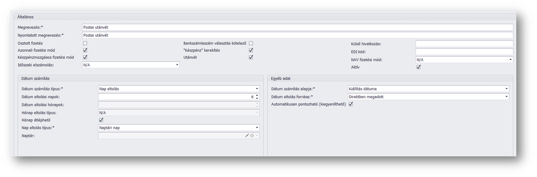 | Dátum eltolási napok: | a napok száma, mellyel meghatározzuk, hogy a dátumszámítás alapjához képest, mikor válik esedékessé a fizetési kötelezettség. |
