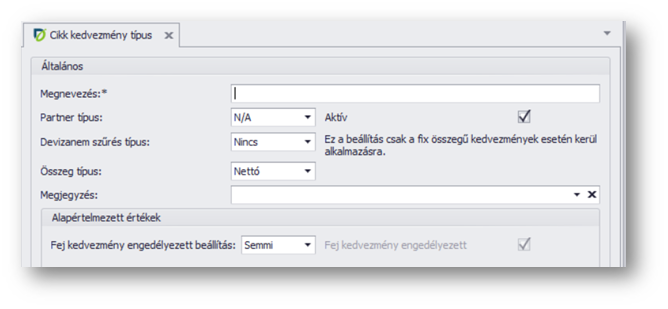 | Partner típus: | N/A / Vevő / Szállító, választás, amely meghatározza, hogy vevőknél, vagy szállítóknál, vagy bármelyiknél tudjuk használni a kedvezmény típust. |