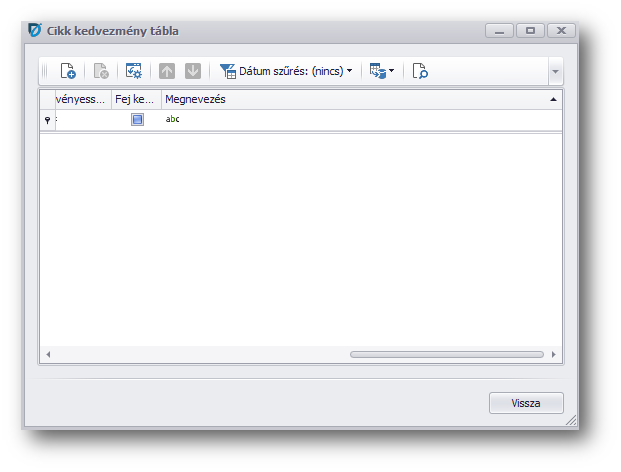 Az Ár és kedvezmény / Cikk kedvezmény tábla művelet elindítása után a "Cikk kedvezmény tábla" ablakban megjelennek a jelen cikk kedvezmény típusra felvett kedvezmények (Cikk kedvezmény tábla), ahol megnézhetjük, hogy kire / mire vonatkoznak, mi az érvényességi dátumkorlátjuk és hogy, mely cikknek mi a konkrét kedvezménye. A táblázatba új sorokat szúrhatunk be, vagy a meglévő sorokon duplaklikkelve szerkeszthetjük az kedvezmény tábla adatokat, köztük a kedvezmény %-okat. A művelet elérhető a Vevő, Szállító, Cikk, Partner kereskedelmi kampány, jelen Cikk kedvezmény típus, Cikk kedvezmény csoport és a Partner kedvezmény csoport funkciókból.