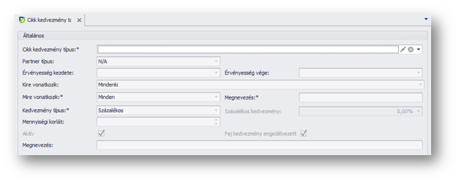 | Partner típus: | (N/A / Vevő / Szállító) A választott cikk kedvezmény típusban megadott "Partner típus" alapján kitöltődő nem módosítható mező, ami meghatározza, hogy mely partner típusra vonatkozik a kedvezmény tábla. |