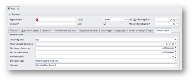 | Extra adat alap: | A mező melletti …-ra kattintva extra adatokat vehetünk fel a cikkhez, vagy ha már vettünk fel, akkor megnézhetjük azok értékét. A megjelenő ablakban a Szöveges extra lapfülön 10 darab szöveges adatot, míg az Egyéb extrák lapfülön Szám, Dátum és Logikai típusú adatokból rögzíthetünk 10-10-et. Amennyiben vettünk fel extra adatokat, akkor a mezőben azt látjuk kiírva, hogy a négy extra típusból típusonként hányat rögzítettünk. A Szöveges extra mezőkbe a Bizonylati megjegyzés funkcióba felvett megjegyzésekből (fej, sor) is választhatunk. Ezekben az extra mezőkben olyan adatokat tarthatunk nyilván a cikkről, amelyekre a rendszerben nincs dedikált mező. Ezeket nyilvántartásra és szűrésekre használhatjuk. Az extra adat mezőket az Extra adat beállítás funkcióban egyedi címkékkel ruházhatjuk fel, maszkolhatjuk és ellenőrzési szabályokat definiálhatunk rájuk. |