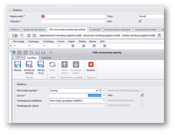 | Tizedesjegyek beállítása: | a kiegészítő mennyiségi egység esetében meghatározható, hogy a mennyiségi egységben beállított tizedesjegy formátumot, vagy attól eltérőt szeretnénk használni. |