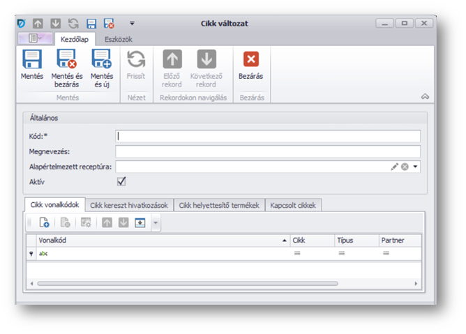 | Kód: | Cikk változat kódja. A felhasználó adja meg, szám és betű értéket egyaránt tartalmazhat. |