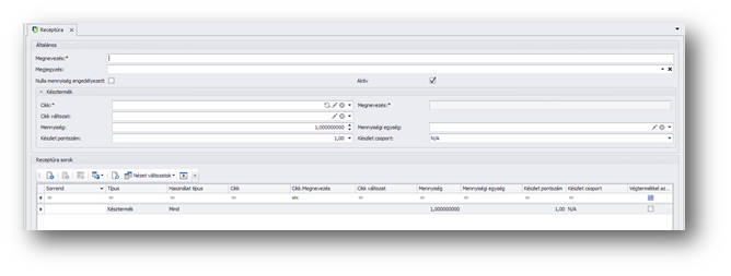 | Aktív: | I/N, beállítással meghatározható, hogy az adatot receptúra kiválasztható-e gyártási bizonylat rögzítésekor. |