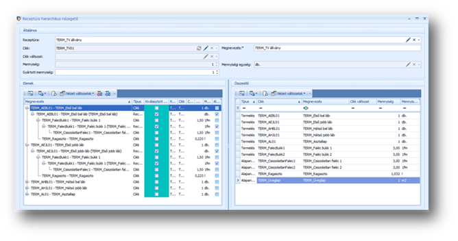 A listás áttekintőből indítható művelettel a kijelölt receptúrában szereplő összetevők jelennek meg a "Receptúra hierarchikus nézegető" ablakban. Ennek a bal oldalán fel/le nyitható fastruktúra található, amelyben a többszintű receptúrák is látszanak (lenyithatóan). A táblázat fejlécében az "Összes kinyitása", "Összes becsukása" műveletekkel a teljes fastruktúra nyitható/csukható. A jobb oldalon az összességében kialakuló (kibontott) alapanyag szükséglet jelenik meg. (Bal oldali Cikk típusú sorok összegezve.) A táblázatok feletti "Gyártott mennyiség" mezőben megadható az a mennyiség, amennyit szeretnénk a késztermékből legyártani a receptúrában megadottak szerint. A "Receptúra" mezőben alapértelmezésben a listás áttekintőn kiválasztott receptúra szerepel, de ezt lenyitva kiválasztható bármely más receptúra is és akkor arra szűkülnek a táblázatok sorai.