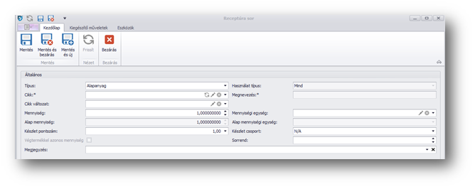 | Alap mennyiségi egység: | A receptúra sorban szereplő cikk alapértelmezett mennyiségi egysége. |