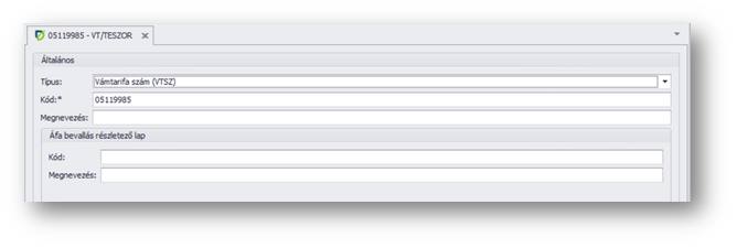 Minden cikket be kell sorolni VT (vámtarifaszám) vagy TESZOR (Termékek és szolgáltatások osztályozási rendszere) szám alá, attól függően, hogy termékről vagy szolgáltatásról beszélünk. Itt rögzíthetjük ezeket a számokat, a hozzájuk tartozó megnevezéssel együtt.