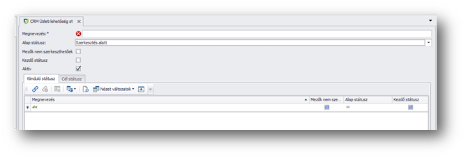 Ezekre az alapstátuszokra építjük fel a státuszokat. Itt jelölhetjük meg azt is, hogy a státuszok közül, melyik lehet kezdőstátusz, amit az üzleti lehetőség típusánál, be tudunk majd állítani. Ez is teljesen ránk van bízva, bármennyi státuszt rögzíthetünk. A státuszoknak meg lehet adni kiinduló- és célstátuszt, amivel az automatikus állapot változtatást tudjuk szabályozni. A lezárt alapstátusz egy statisztikát nem befolyásoló státusz. Erre akkor lehet szükség, ha kiderül az ügyfélről, hogy Ő egy másik üzleti lehetőség, akkor nem egy elveszett üzleti lehetőség, hanem csak lezárt, mert egy másik üzleti lehetőségben folytatódik, aminek a vége viszont már lehet elveszett.