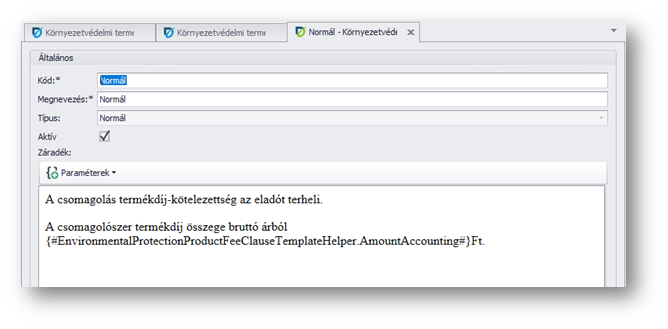 - Környezetvédelmi termékdíj záradék sablon szerkesztő felület -