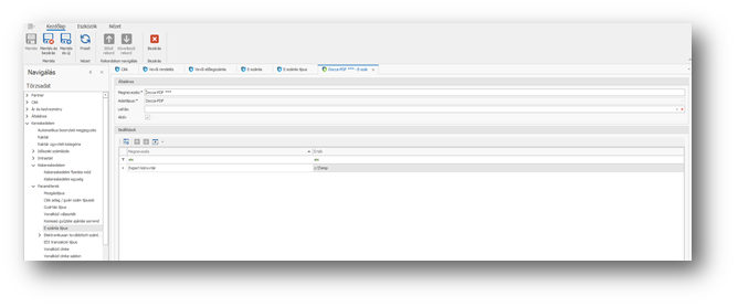 Hozzunk létre egy új e-számla típust a Törzsadatok / Kereskedelem / Paraméterek / E-Számla menüpont alatt. Megnevezése tetszőleges, de legyen beszédes. Az adattípusa legyen Docca-PDF. A beállítások részben az export mappának olyan megosztott mappát állítsunk be, melyet az egyes kliensek, illetve az ütemezett szolgáltatás is el tud érni, és írási olvasási joga van rá. Ennél az e-számla típusnál valós e-számla küldést nem a deep.ügyvitel végzi, hanem egy telepített program, ami az itt beállított mappából olvassa fel a fájlokat, és küldi el a címzettnek. A deep.ügyvitel program az itt beállított export mappába létrehoz egy leíró xml-t, egy számlakép pdf-t, és a NAV OSZ adatszolgáltatás xml fájlt, és ha volt a számlán olyan csatolmány, melyet továbbítani kell e-számlában, akkor azokat is. A telepített küldő program ezeket fogja majd továbbítani.