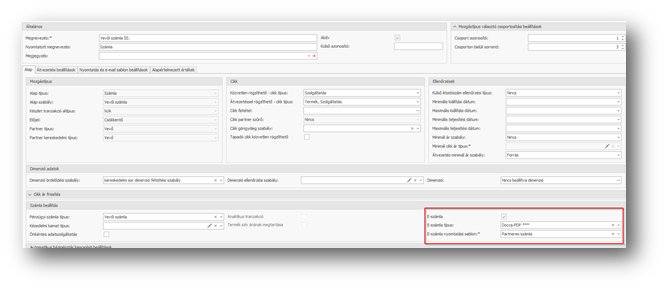 Célszerű beállítani az E-Számla típust is. Ha beállítjuk, akkor minden számla, ami ezzel a mozgás típussal készül, az E-Számla lesz, abban az esetben, ha olyan partnert választunk, akinél engedélyezve van az E-Számla készítés. Ha nem állítjuk be, akkor a partnerből is örökölheti a bizonylat, vagy ha ott sincs megadva, akkor a bizonylaton kell majd megadni.