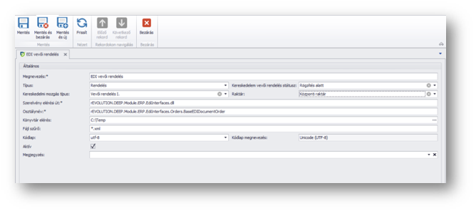 | Osztálynév | A konkrét kommunikációt biztosító osztály neve. pl: rEVOLUTION.DEEP.Module.ERP.EdiInterfaces.Orders.xy, ahol az xy tartalmazza a cégspecifikus fejlesztés nevét, az Orders szegmens utal a rendelésekre vonatkozó adatcserére. |