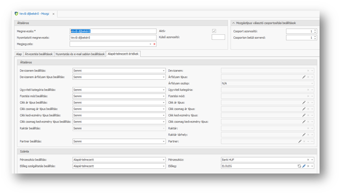 | Devizanem beállítás: | Semmi / Alapértelmezett / Kötelező, választással beállítható, hogy a jelen mozgással felvett bizonylaton a devizanem kötelezően és változtathatatlanul a Devizanem mezőben kiválasztott legyen, vagy a kezdőértéke legyen az, de azért változtatható legyen. |