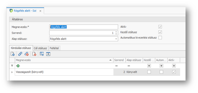| Alap státusz: | Rögzítés alatt / Könyvelt / Kivezetett, választással meg kell adni, hogy a rendszer milyen alap státuszként értelmezze a felvett státuszt. |