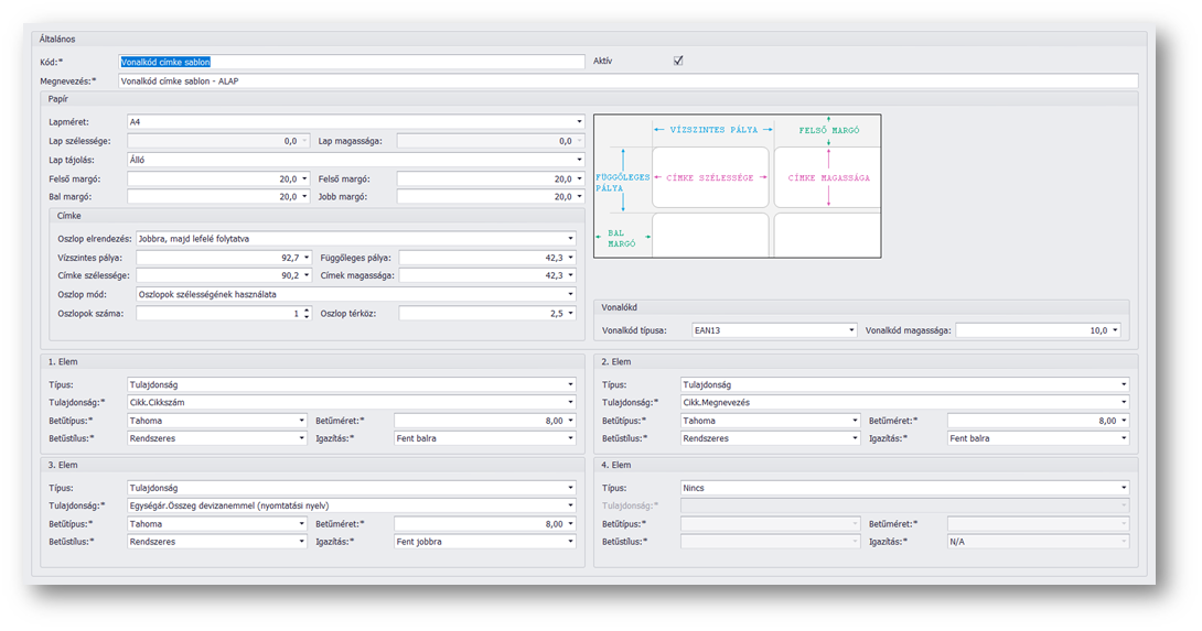 Elem területek (1,2,3,4): A vonalkód alatt megjelenő első, második, harmadik és negyedik mező értékét állíthatjuk be.