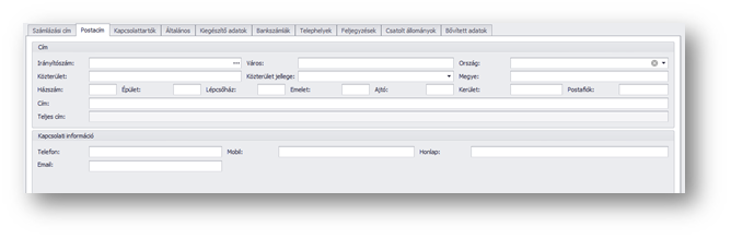 A szállító postacíme, ami formailag megfelel a számlázási címben megadható adatoknak, de eltérhet tőle. A postacímnél is lehetőség van a kapcsolati adatok (telefon, e-mail, honlap név) rögzítésére.